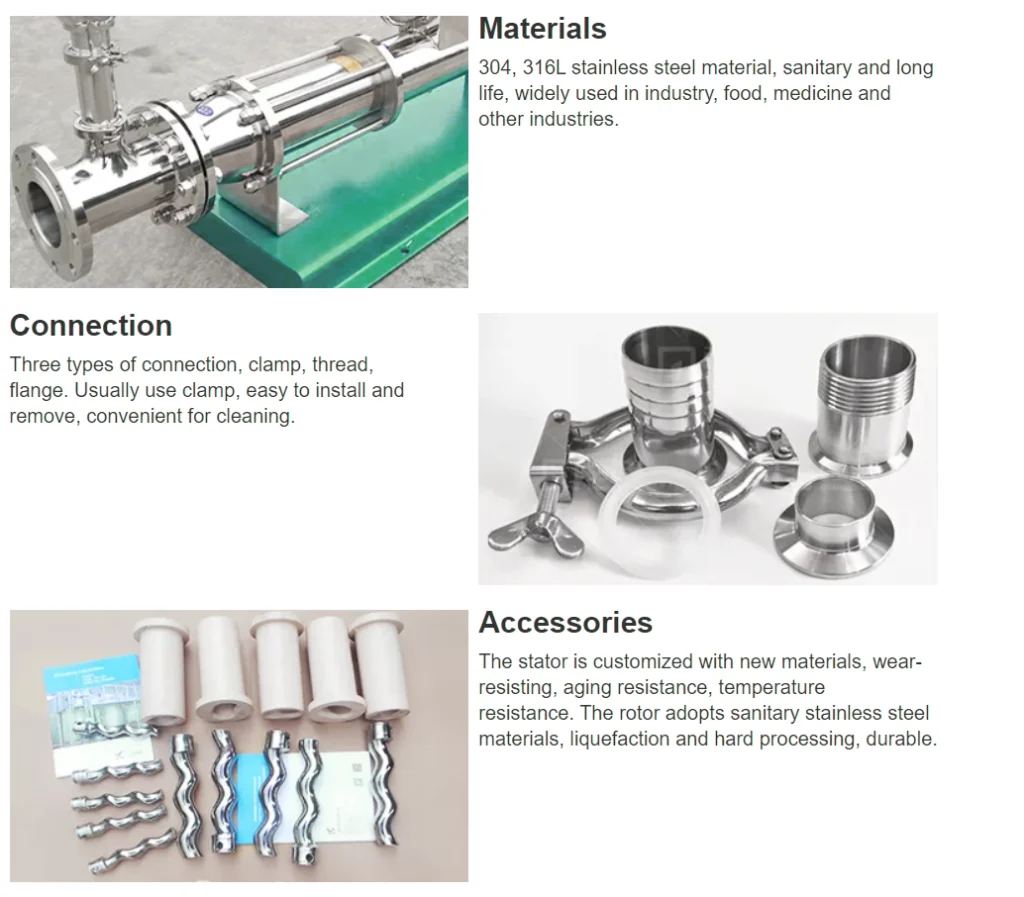 The hopper screw pump has a rectangular hopper and a screw propeller on the connecting rod, which is suitable for media that cannot flow freely but contains liquid. When transporting similar slag liquid, a stirring rod can also be installed to prevent sedimentation. When the slag concentration is high, add a large funnel that can be kneaded and damaged to prevent clogging. The pump can be equipped with various types of drives, suitable for three-phase geared motors. According to customer requirements, the hopper can be customized at the entrance for special materials, insisting on the smoothness of the feeding, and then reaching the feeding and discharging without pressure, higher pump power and longer service life, completely affirming the customer’s problems. The import and export methods can be equipped with clamp quick-installation type, flange type, internal thread, external thread, and union. Pump body materials can be divided into: cast iron, stainless steel 304, stainless steel 316, 316L, selected according to the actual medium requirements.